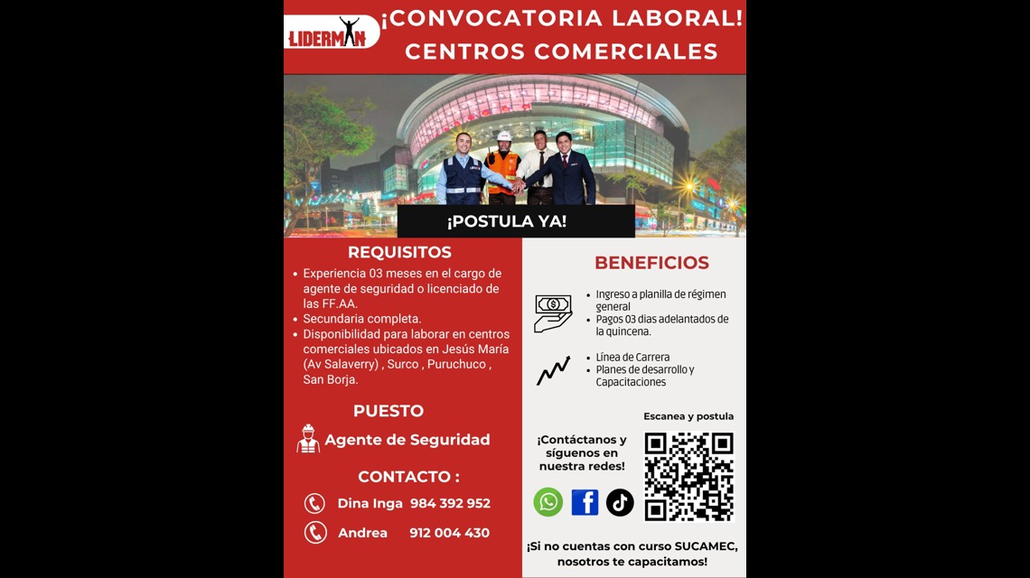 📢Liderman, empresa con más de 36 años de experiencia en seguridad, se encuentra en la búsqueda del mejor talento para asumir el cargo de AGENTE DE SEGURIDAD para importantes unidades.